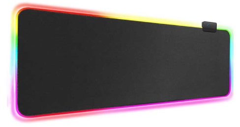 The size is enough for any keyboard and a mouse: 31.49×11.81×0.15 inches. The pad connects to the computer via a USB port which makes it light up.