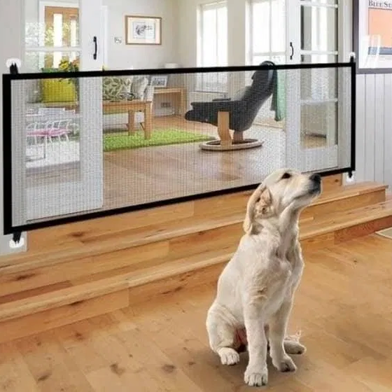 It’s easy to store since it’s flexible and takes up way less space than a baby gate. It holds back my dogs and is very easy to install onto any door or pathway.