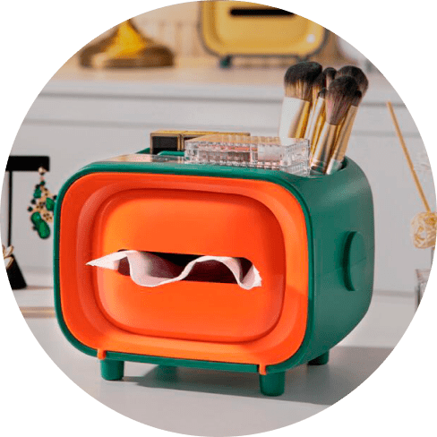 Easily distributes tissues and holds makeup brushes and etc on top. I really like it.